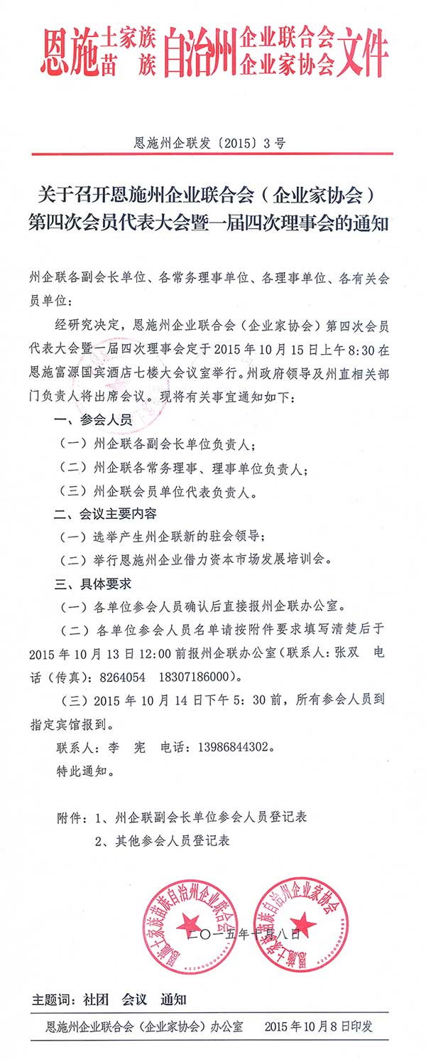 关于召开恩施州企业联合会(企业家协会)第四次会员代表大会暨一届四次理事会通知