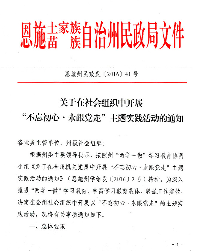依据州委主要领导批示,按照州“两学一做”学习教育协调小组的有关要求,为深入推进“两学一做”学习教育,丰富学习教育载体、增强工作实效,现将州民政局《关于在社会组织中开展“不忘初心·永跟党走”主题实践活动的通知》(恩施州民政发﹝2016﹞41号)予以转发,并将有关事项通知如下: