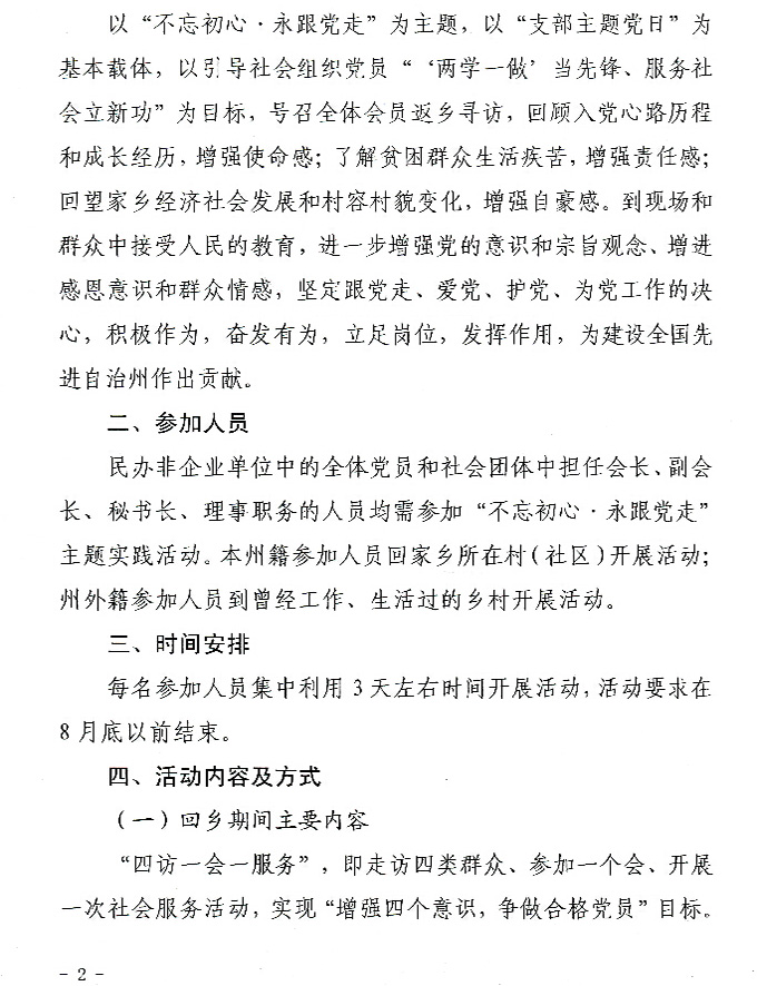 每名参加人员根据州民政局《关于在社会组织中开展“不忘初心·永跟党走”主题实践活动的通知》所明确的活动内容及方式,集中利用3天左右时间开展活动,活动要求在8月底以前结束。