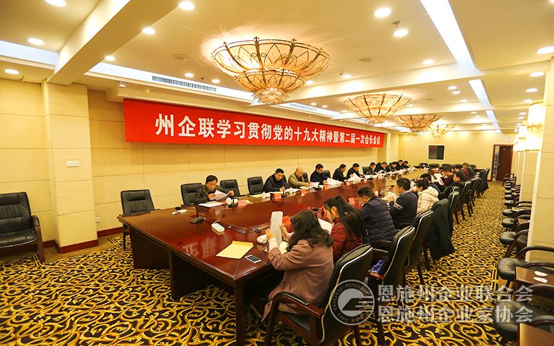 2018年1月15日,州企联学习贯彻党的十九大精神暨第二届一次会长会议在恩施富源国宾酒店举行。会议以党的十九大精神为指引,研究部署州企联2018年度的工作。