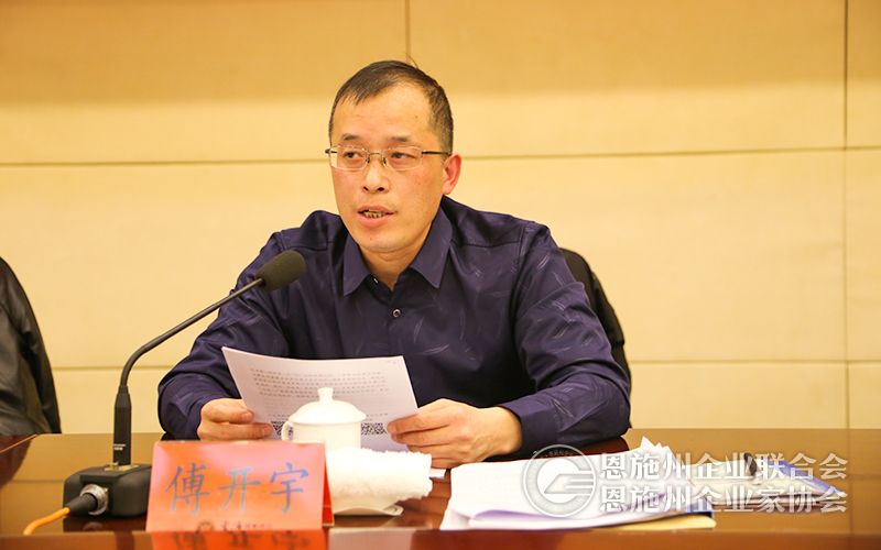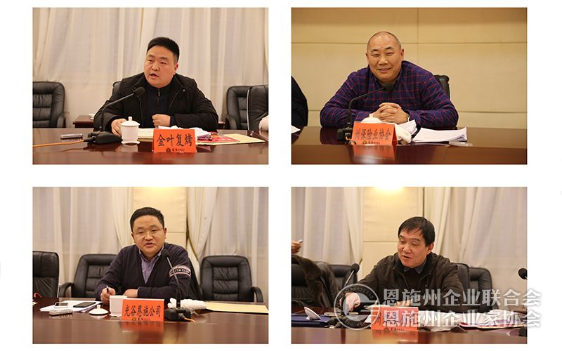 恩施州国有资本投资运营有限公司、湖北省烟草公司恩施州公司、湖北烟草金叶复烤有限责任公司、武汉光谷联合产权交易所恩施产权交易有限公司、恩施州保险行业协会、湖北中烟工业有限责任公司恩施卷烟厂、恩施州交运运输集团有限公司、恩施州银行协会等州企联副会长单位负责人在会上发言,对州企联的工作提出了许多建设性意见。
