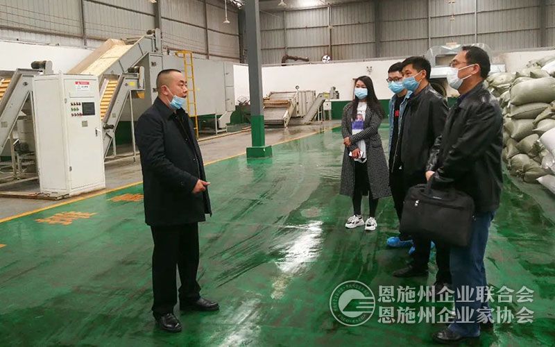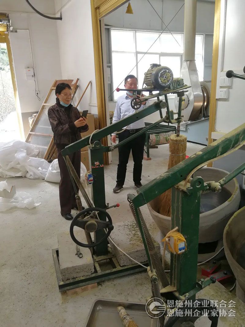 恩施州银行业协会秘书长李伟(右一)、来凤农商行董事长董学军(右二)深入来凤县凤韵藤茶加工厂调研