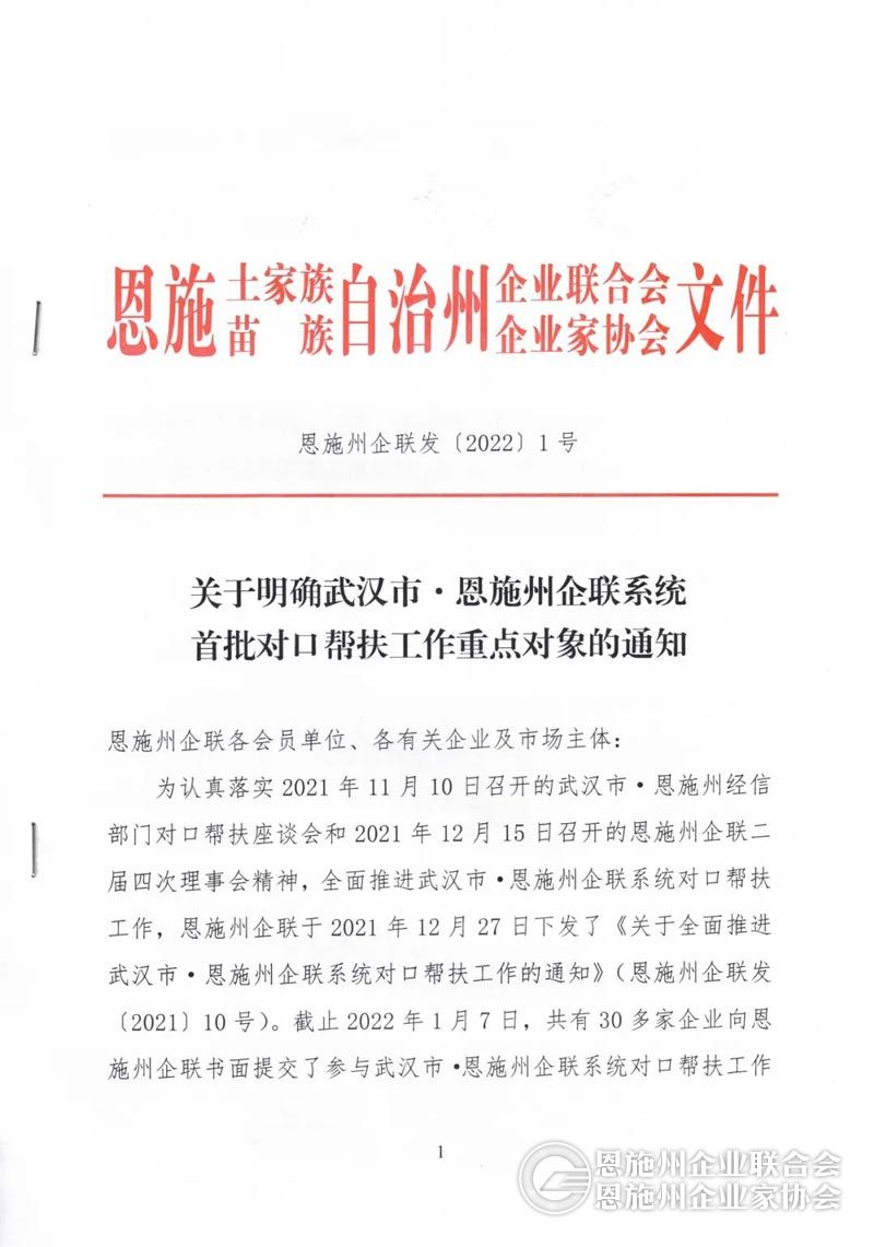 2021年4月22日,时任省委常委、武汉市委书记王忠林率队来恩施州开展对口帮扶工作并召开座谈会。恩施州企联按照会议精神,主动作为,于2021年6月初专程到武汉企联对接沟通,积极推动武汉市企业和企业家对口帮扶恩施州,并与武汉企联达成了初步意向。2021年11月10日,武汉市、恩施州经信部门共同召开对口帮扶座谈会。会议明确了恩施州企联在对口帮扶工作中的职责和内容。