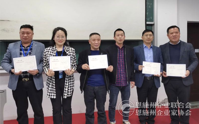 恩施州企联秘书长刘力(右三)在结业仪式上为恩施州参训学员颁发结业证书。