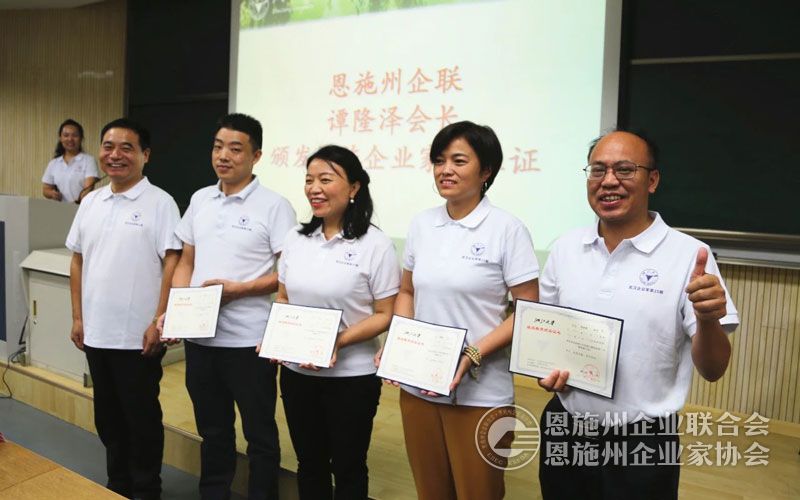 2022年8月,恩施州企联协调推荐的湖北创偲诺电气科技股份有限公司董事长邓小青、鄂西卷烟材料厂厂长陈忠华、宣恩县伍台昌臣茶业有限公司副总经理贵体恩、湖北欧士德户外用品有限公司董事长谭黎敏等四位企业家参加了武汉企业家浙江大学第25期培训班。恩施州企业家学员参加武汉企业家浙大培训班,这在武汉企业家浙大培训班历史上是首创。