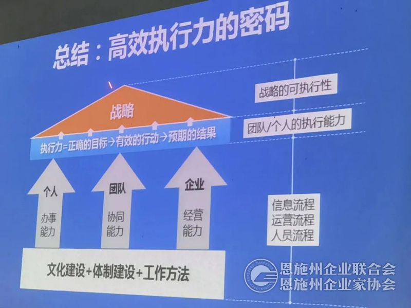在提升企业执行力方面,加强体制和文化建设。体制包含组织设计、制度、人事等内容。企业文化=共同的价值观×共同的思维方式×共同的行为模式。优化、健全的流程和制度是执行力的源动力。