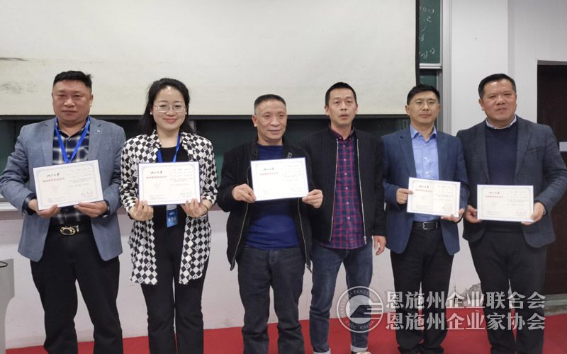 恩施州企联秘书长刘力(右三)在武汉企业家浙江大学第26期培训班结业仪式上为恩施州参训学员颁发结业证书。