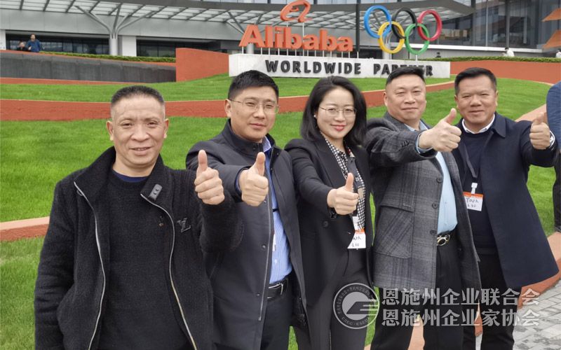 武汉企业家浙江大学第26期培训班恩施州参训学员在阿里巴巴集团留影(左起:郭中俊、周和俊、刘腊元、王少龙、邓建华)。
