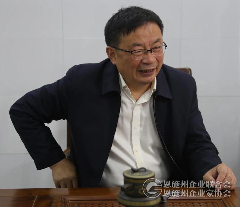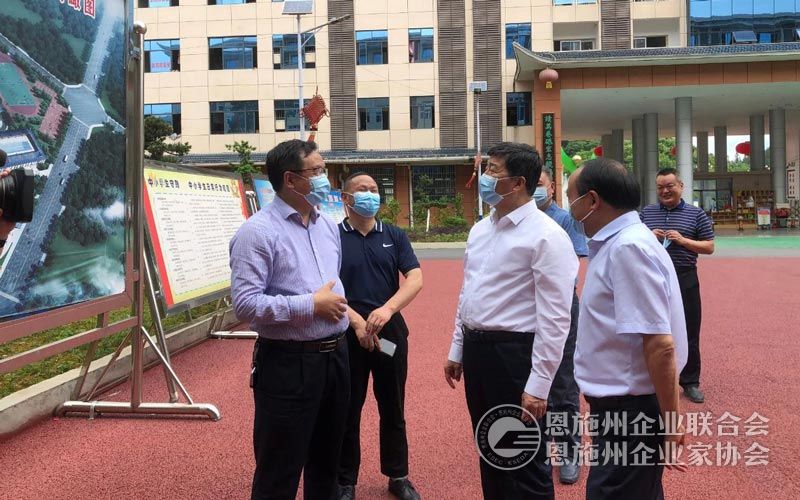 咸丰春晖学校理事长张昌奎(左一)向州委书记胡超文(左三)汇报学校有关情况。