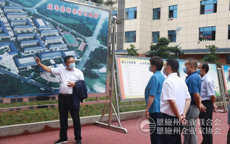 咸丰春晖学校理事长张昌奎(左一)向县委书记郭玲(左二)汇报学校有关情况。