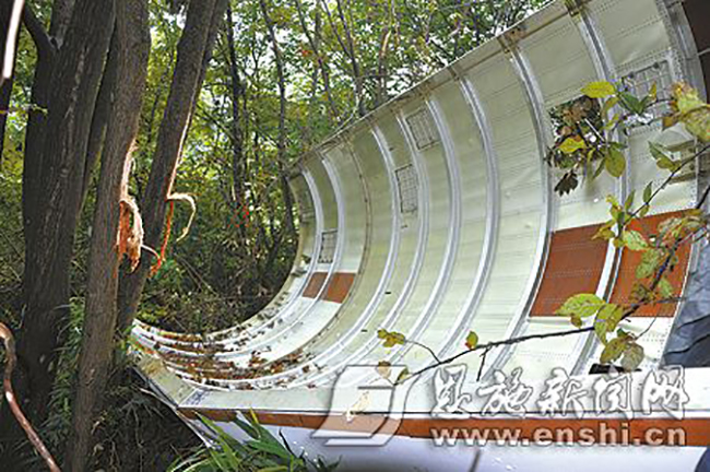 8月22日白天,家住恩施市沐抚办事处前山村街平组村村民朱福宽,在屋后收拾烤烟时,突然看见天空中掉落下一庞然大物,落在了离他家不远的树林里。从来没有见过这么大物体从天而降,朱福宽吓得连手中的铁铲都掉在了地上。过了一会儿,朱福宽回过神一想,最近在电视上老看到有飞机出现事故,会不会是飞机掉下来了。