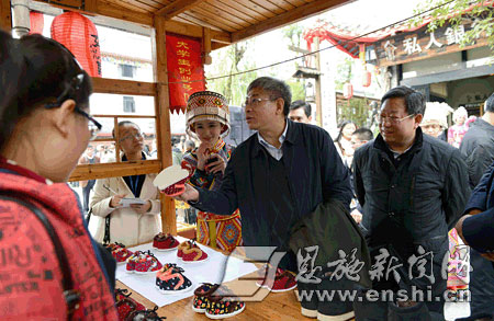 国务院扶贫办副主任欧青平(中)在恩施土家女儿城大学生创业摊位了解经情况。(记者 梅珂 摄)