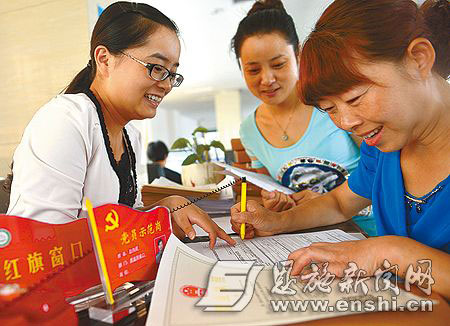 8月13日,建始县政务服务中心大厅,县质监局红旗窗口的党员示范岗工作人员指导群众填写表格。在践行党的群众路线中,该县充分发挥党员窗口示范带头作用,开展了一系列温馨“微”服务(资料图)。(记者刘波本报恩施图片库齐潇潇刘元芳摄)