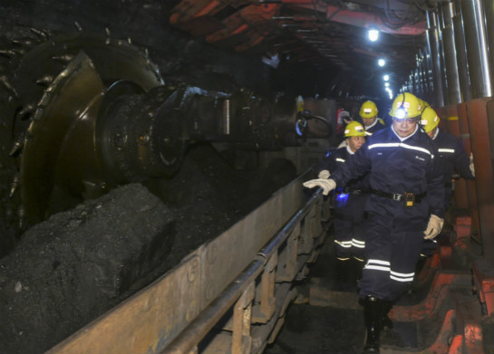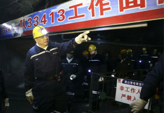 随后,总理坐上矿车入井考察煤矿生产。该矿建于1960年,曾创下亚洲单井口出煤量第一的纪录。总理井下乘车6公里、步行1公里才来到垂直深度300多米的综采工作面。他在这里为山西鼓劲打气。整个井下考察历时2小时。