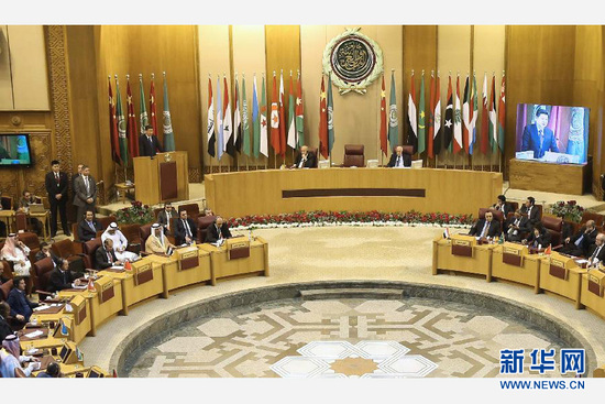 国家主席习近平在开罗阿拉伯国家联盟总部发表题为《共同开创中阿关系的美好未来》的重要演讲。 新华社记者 庞兴雷 摄
