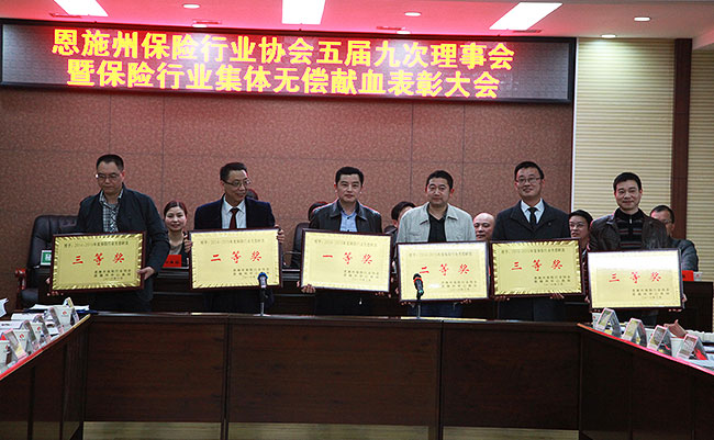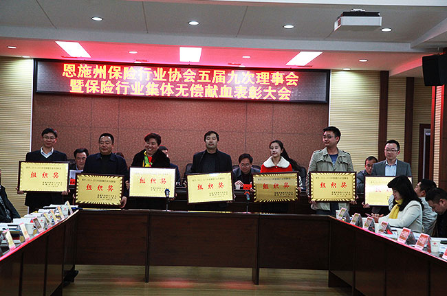 “恩施州2015年被授予全国无偿献血先进市(州),保险行业作出了突出贡献。”3月7日,州卫计委党组书记段怀刚在我州保险行业集体无偿献血表彰会说。在本次会议上,州保险行业协会也表彰了2014—2015年度“全州保险行业集体无偿献血优秀单位”和连续两年以上献血的“优秀个人”。富德生命人寿恩施中心支公司、太平人寿恩施中心支公司、人保财险恩施分公司等获得表彰,保险行业刘旭祥等18名连续4年无偿献血者、王伍祎等22名连续3年献血者、陈燕等37名连续2年献血者获得“优秀个人”荣誉称号。