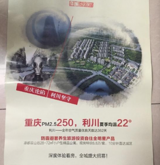前天上午,一则关于湖北利川某楼盘在渝发放的促销广告,因打出“重庆沦陷,利川坚守”、“重庆PM2.5 250”等敏感口号,而引来重庆市民的强烈不满,指其有诋毁重庆形象之嫌。此事经重庆晚报报道后,迅速引起工商部门的重视。昨天上午10时许,江北工商分局工作人员来到观音桥朗晴广场,对该楼盘重庆代销处进行了查处。