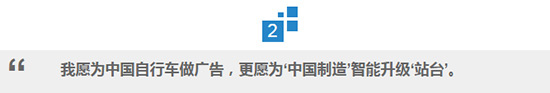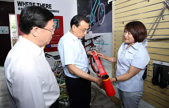 6月26日,李克强来到飞鸽自行车天津胜利路体验店。这里摆放着不同档次、材质和性能各异的自行车。总理来到一辆碳纤维自行车前掂了掂重量,又亲自体验了一下这辆超级智能自行车的性能。他说,我愿为中国自行车做广告,更愿为“中国制造”智能升级“站台”。总理还说,希望你们打造中国传统企业的“百年老店”。发扬勇于创新的企业家精神,追求精益求精的工匠精神,让老树不断发新芽,更加枝繁叶茂