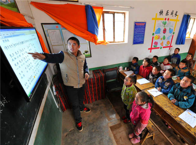 宁夏西海固地区泾源县泾河源镇底沟村教学点的老师利用多媒体教学设备给学生们上课。(新华社记者彭昭之2015年3月19日摄)