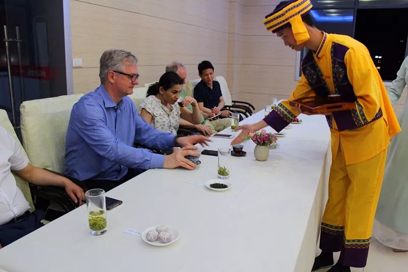 作为东道主金果茶业,热情款待外国客商,并在公司举办了丰富多彩的土家特色茶艺会, 积极展现了土家恩施硒茶文化。