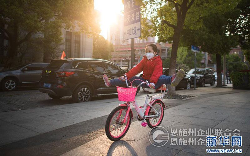 小朋友在武汉吉庆街附近骑单车(4月12日摄)。 新华社记者 肖艺九 摄