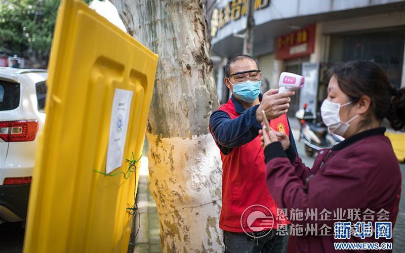 志愿者杨学彬(左)在武汉多闻社区卡口检测居民体温(4月25日摄)。 新华社记者 肖艺九 摄