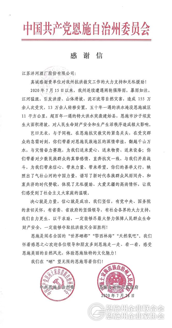8月10日,洋河股份收到了来自中共恩施州委、恩施州人民政府的感谢信。