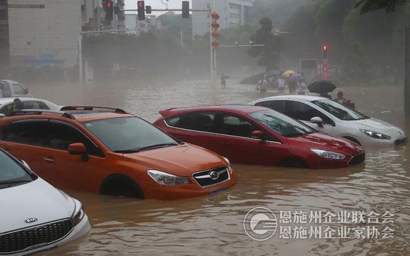 7月17日,受持续暴雨天气影响,恩施城区清江干流水位猛涨,同日16时左右,清江河水漫过两岸,沿岸主干道积水2米左右,金桂大道、施州大道等中心城区内涝严重,舞阳坝、机场路、胜利街被洪水连成一片,水灾所到之地到处漂浮着水淹汽车,财产损失惨重。“商铺水中泡,汽车水上漂”的场景成为这次洪灾的真实写照。