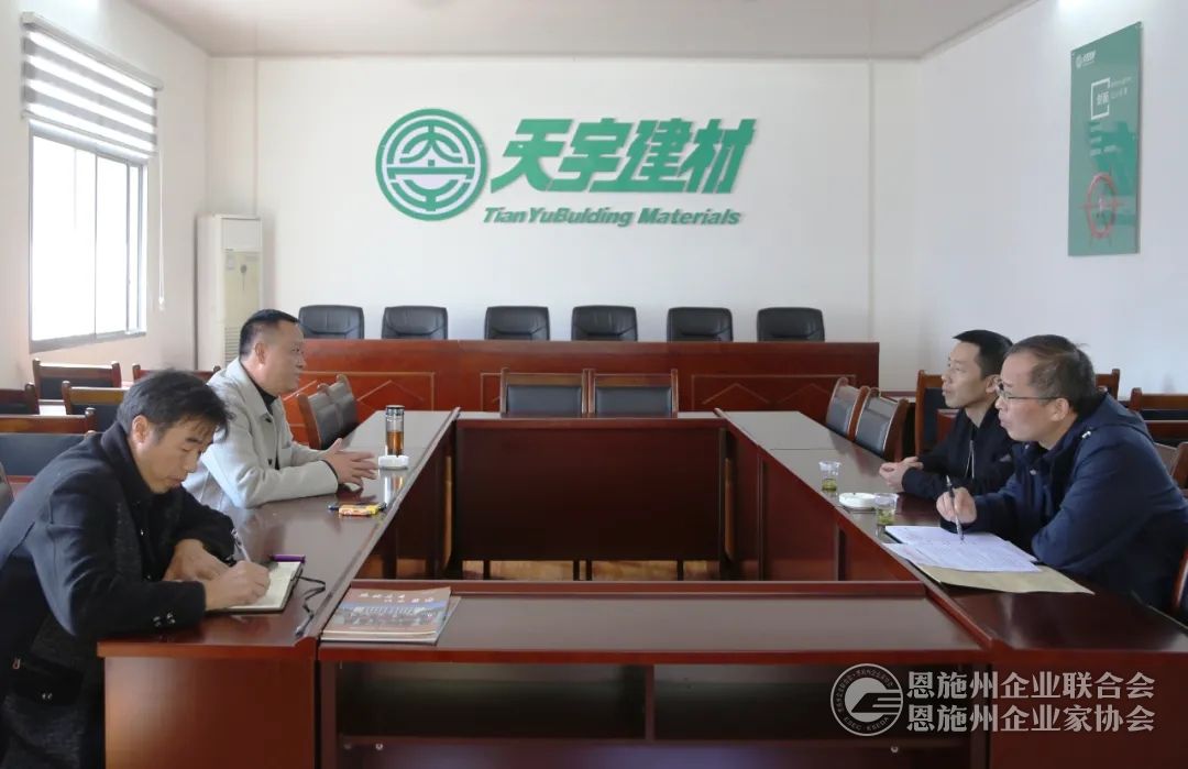 来凤天宇副总经理谢群(左二)向恩施州企联秘书长刘力(右二)、副秘书长兼办公室主任傅开宇(右一)介绍有关情况。