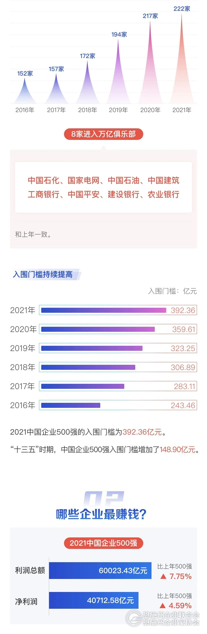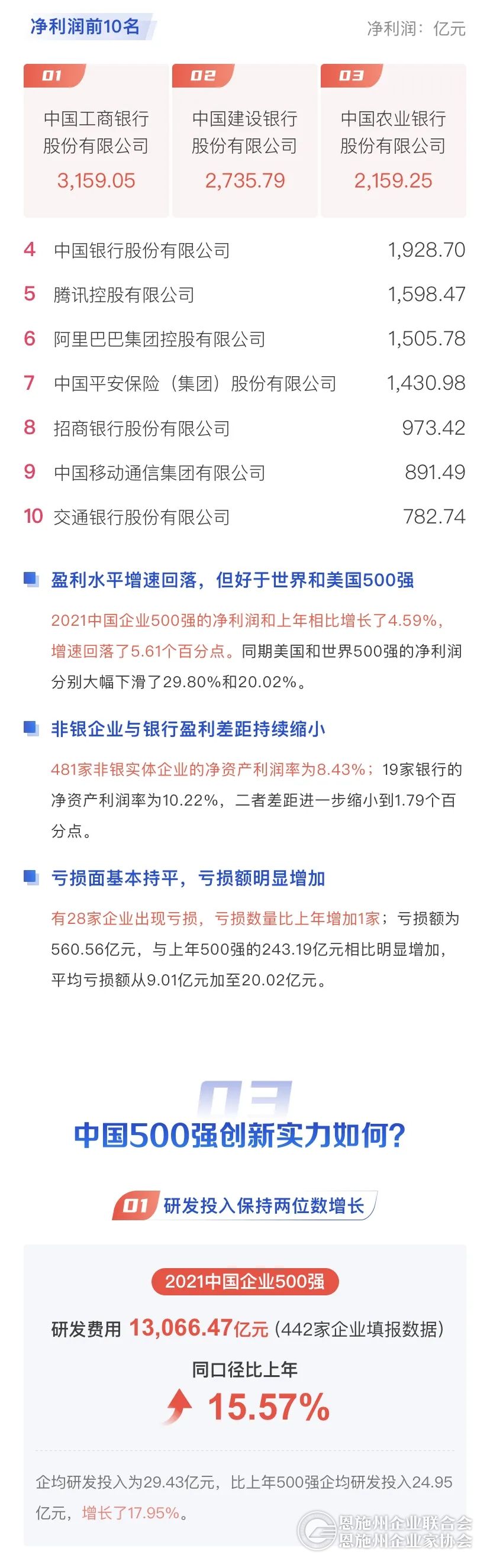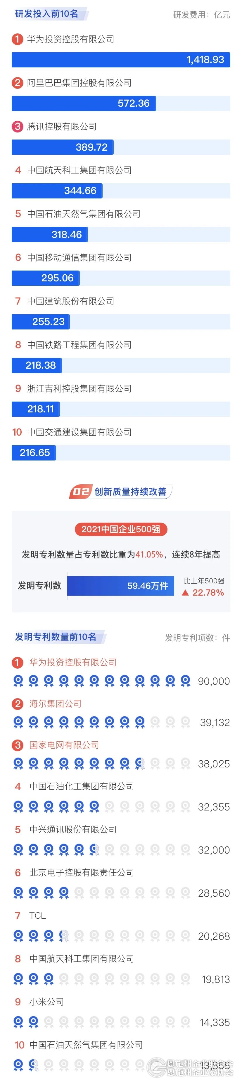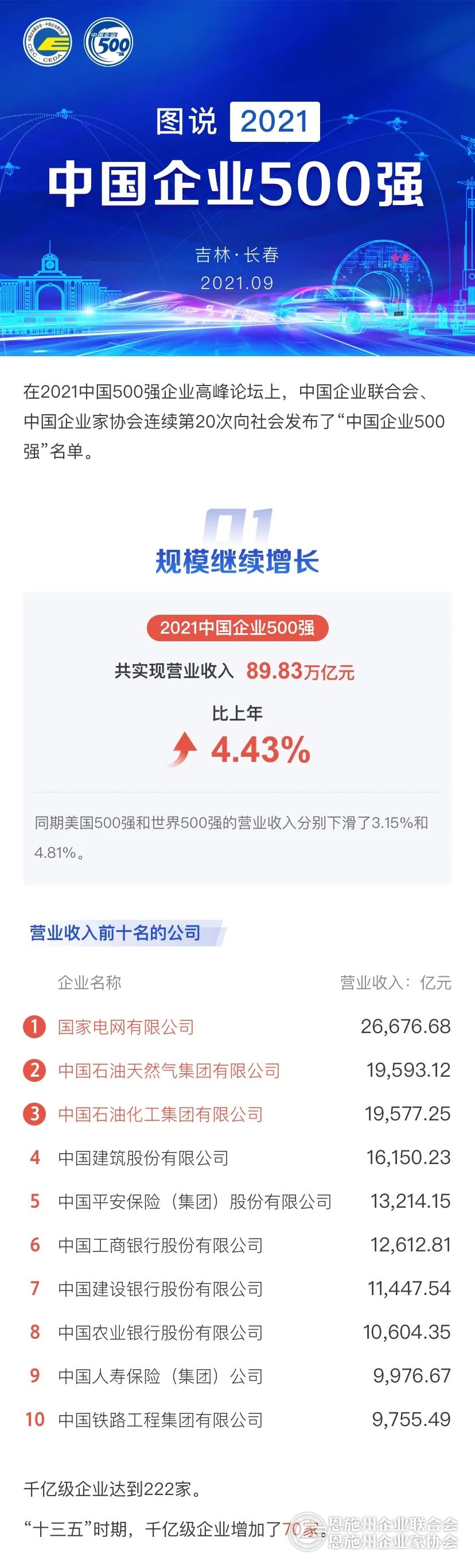 9月25日,中国企业联合会、中国企业家协会在吉林长春发布了2021中国企业500强、中国制造业企业500强、中国服务业企业500强、中国100大跨国公司、中国战略新兴产业领军100强、中国大企业创新100强企业名单及其分析报告,同时还发布了《中国企业500强20年报告》。