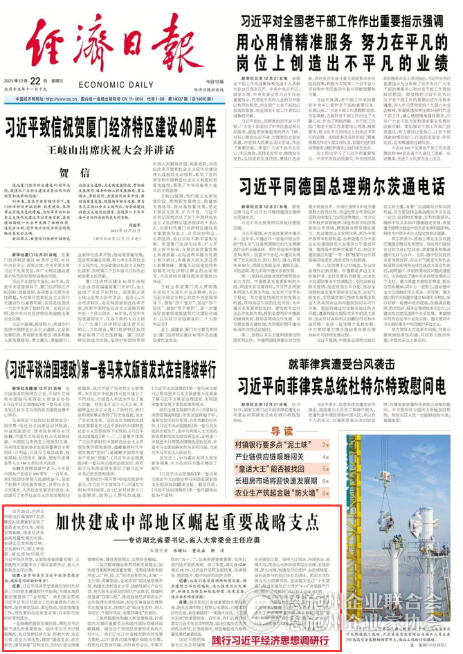 应勇:推动中部地区高质量发展,是以习近平同志为核心的党中央统筹国内国际两个大局、促进区域协调发展作出的重大决策部署。《意见》特别强调“中部地区特别是湖北省经济高质量发展和民生改善需要作出更大努力”。湖北紧紧围绕习近平总书记赋予湖北“建成中部地区崛起重要战略支点”的历史使命,抢抓历史机遇,抓好《意见》贯彻落实,力争率先在中部地区实现绿色崛起,打造全国重要增长极。