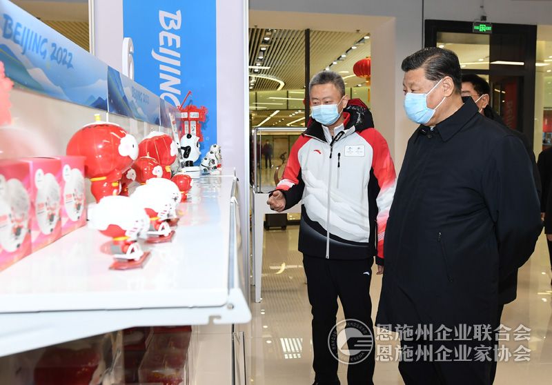 1月4日,中共中央总书记、国家主席、中央军委主席习近平在北京考察2022年冬奥会、冬残奥会筹办备赛工作。这是4日上午,习近平在北京冬奥村(冬残奥村)广场区察看官方特许商品零售店。新华社记者 谢环驰 摄