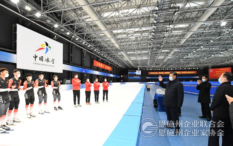 1月4日,中共中央总书记、国家主席、中央军委主席习近平在北京考察2022年冬奥会、冬残奥会筹办备赛工作。这是4日下午,习近平在二七厂冰雪项目训练基地速滑馆,向参训运动员、教练员表示慰问。新华社记者 谢环驰 摄