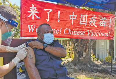 2021年7月13日,巴布亚新几内亚当地民众在首都莫尔兹比港总医院接种中国新冠疫苗。