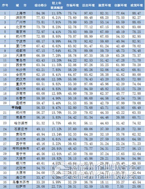 从五个一级指标来看,各参评城市市场环境、法治环境、融资环境、创新环境和政策环境整体均有所改善,得分均值分别为52.80、75.68、43.71、41.95和68.49,分别比上次评估增长6.65%、7.65%、12.40%、4.52%和15.42%。
