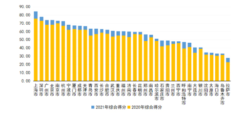 评估显示,2021年度各参评城市综合得分均值为56.53,比上次评估得分均值(51.63)增长9.49%。所有参评城市综合得分较上次均有所提升,超过5%的城市有33个,占比达91.67%;超过10%的城市有12个,占比达33.33%。