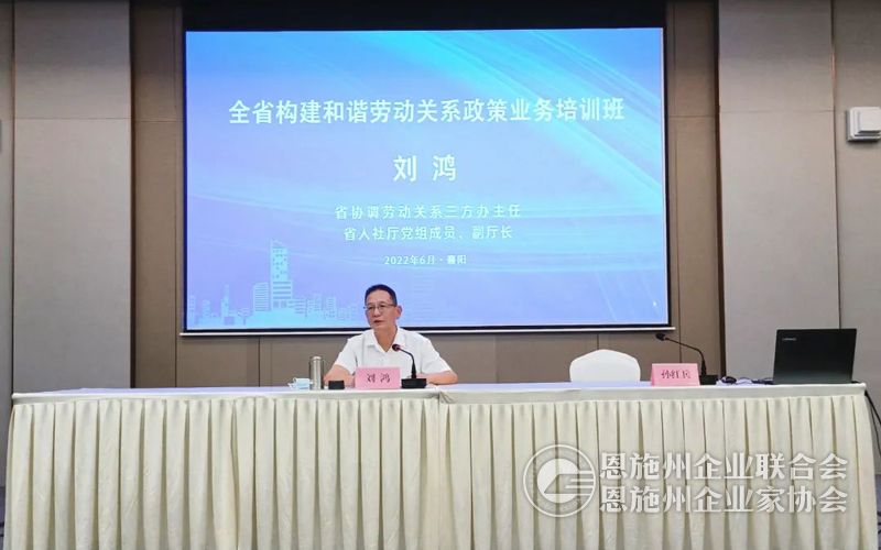 为进一步提升全省劳动关系领域治理能力和治理水平,深入推进2022年度劳动关系领域各项工作,努力构建和谐劳动关系。6月28日至29日,由湖北省协调劳动关系三方委员会办公室主办的全省构建和谐劳动关系政策业务培训班在襄阳市民发瑞际酒店举行。省协调劳动关系三方委员会办公室主任、省人社厅党组成员、副厅长刘鸿出席并讲话。全省各市、州、直管市、神农架林区协调劳动关系三方四家成员单位,省文资办、省财政厅、省政府国资委各管理企业人力资源部门负责同志及有关人员共70余人参加培训。恩施州企业联合会(企业家协会)派专人参训。