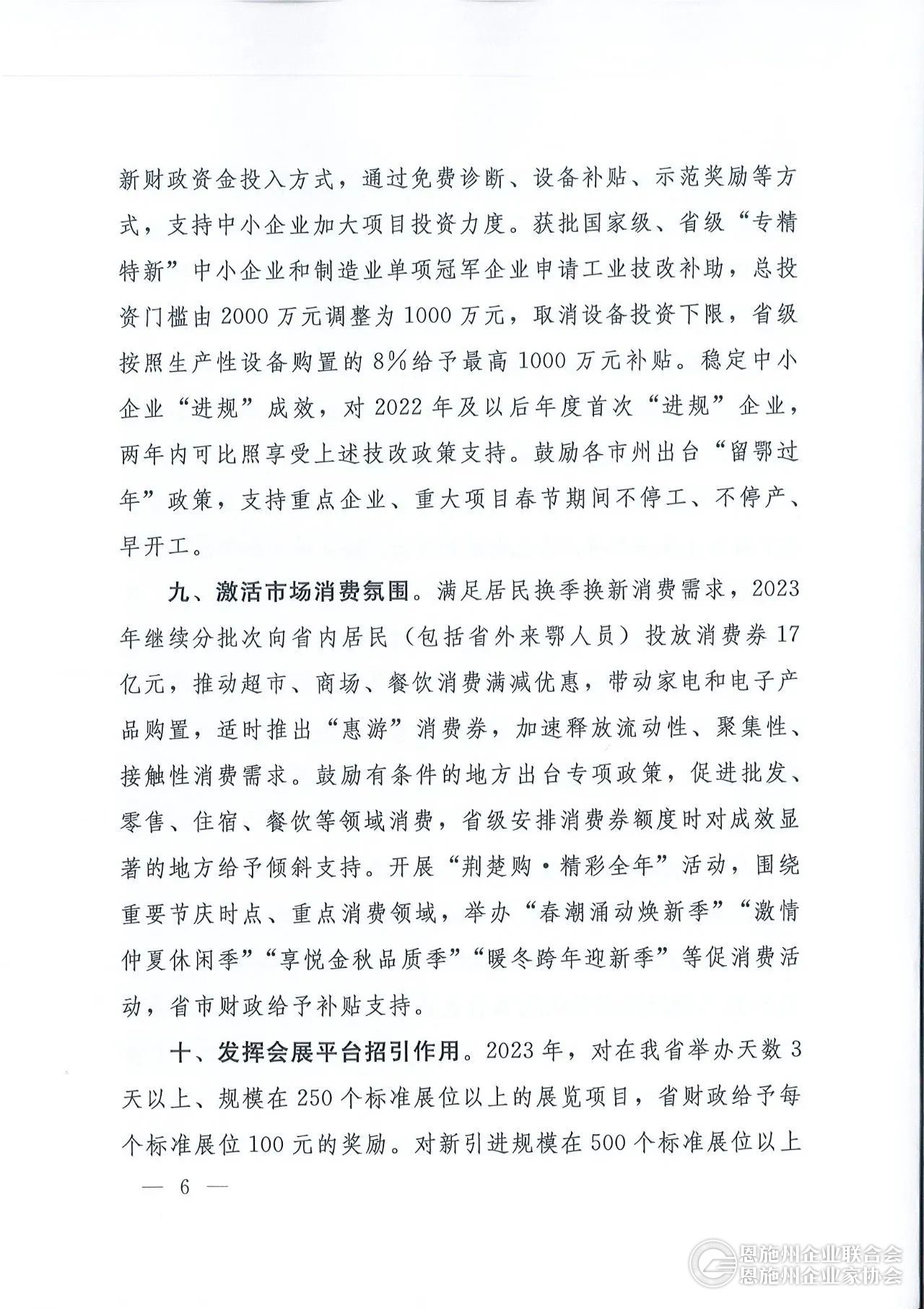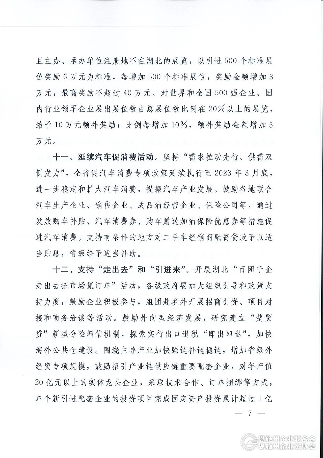 支持会展经济发展。发挥会展经济招引作用,有效促进经济合作和经贸交流。2023年,对在我省举办天数3天以上、规模在250个标准展位以上的展览项目,省级财政奖励每个标准展位100元。对新引进规模在500个标准展位以上且主办、承办单位注册地不在湖北的展览,以引进500个标准展位奖励6万元为标准,每增加500个标准展位,奖金增加3万元,最高奖励不超过40万元。对世界和全国500强企业、国内行业领军企业展出展位数占总展位数比例在20%以上的展览,给予10万元额外奖励;比例每增加10%,额外奖励金额增加5万元。