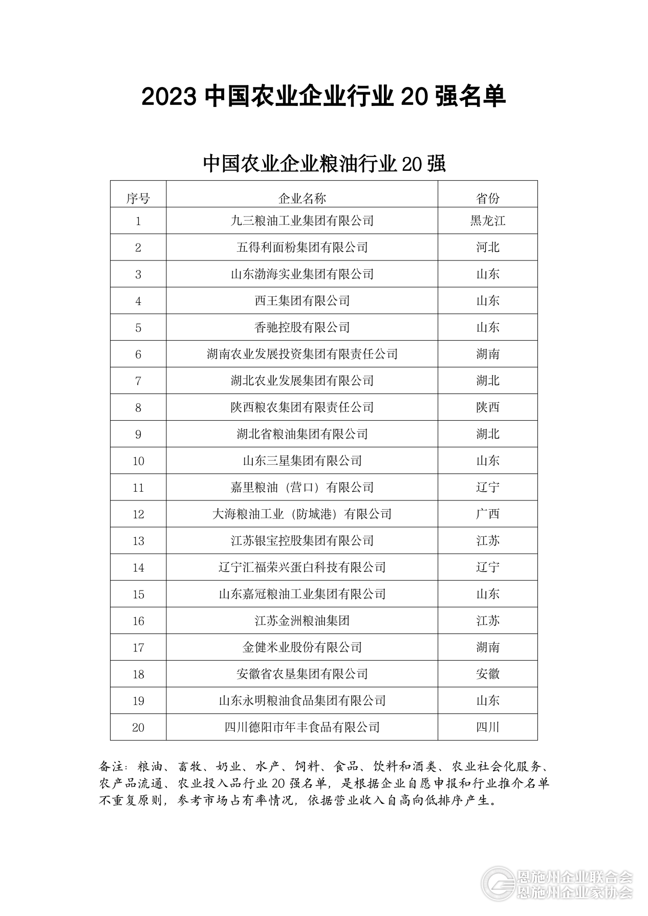 据悉,该活动由农民日报社发起,已经连续举办多年。活动参照国际通行评价办法,由企业按照要求进行申报或采用公开数据,参考利润和企业信誉等数据,依据2022年农业企业营业收入排序产生。此次入围中国农业企业500强的湖北企业还有湖北新洋丰农业科技公司、湖北省粮油集团有限公司、安琪酵母股份有限公司,湖北省粮油进出口集团和湖北省现代农业等11家公司。