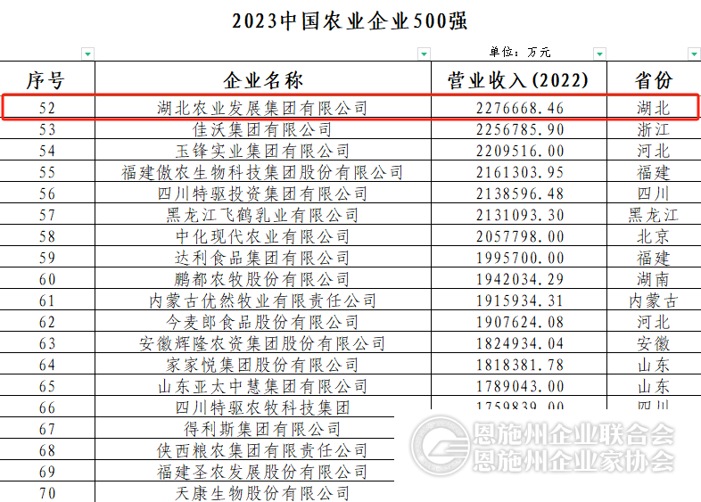 湖北11家企业入围中国农业企业500强,湖北农发集团排第52名
