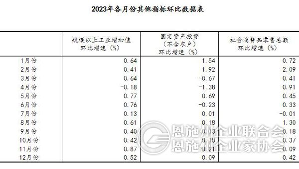 (2)根据季节调整模型自动修正结果,对近一年来各期国内生产总值、规模以上工业增加值、固定资产投资(不含农户)、社会消费品零售总额环比增速进行修订。修订结果及2023年四季度GDP环比数据、2023年12月份其他指标环比数据如下: