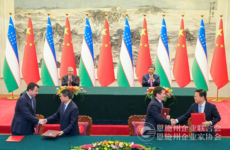 1月24日下午,国家主席习近平在北京人民大会堂同来华进行国事访问的乌兹别克斯坦总统米尔济约耶夫举行会谈。这是会谈后,两国元首共同见证签署一系列合作文件。新华社记者 丁林 摄