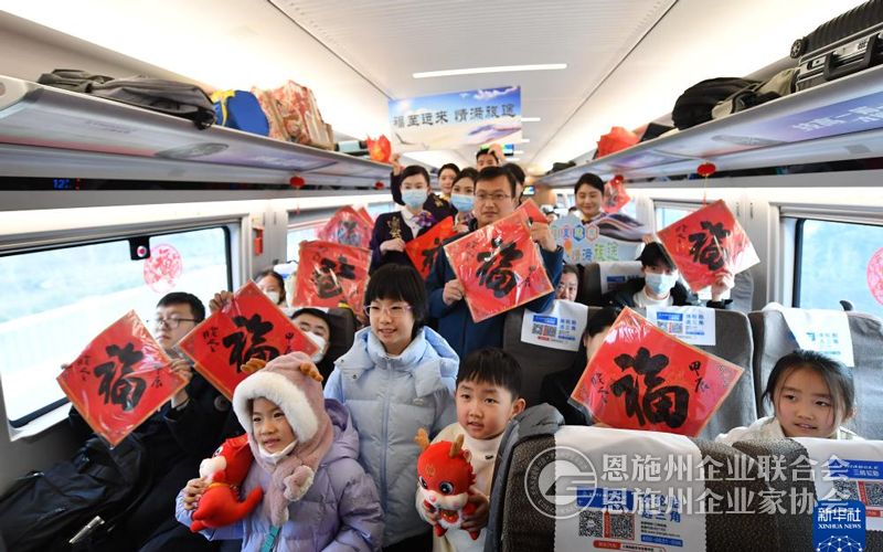1月26日,在由南京南站发往太仓的G8981次列车上,南京客运段的工作人员与收到“福”字的旅客合影。新华社记者 柳文惠 摄