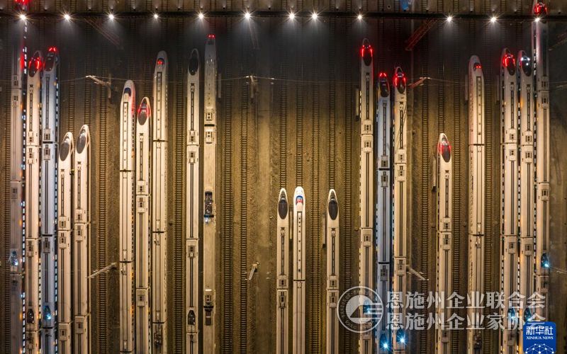 1月26日凌晨,动车组列车停靠在南京动车段南京南动车运用所存车线上(无人机照片)。新华社发(方东旭摄)