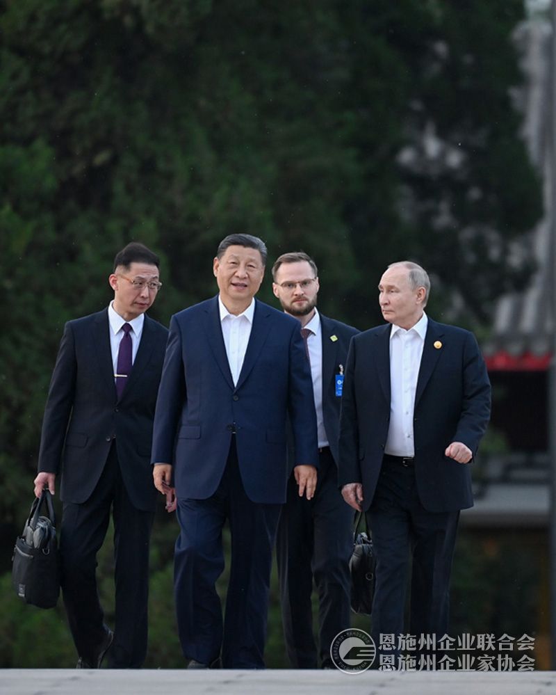 习近平在瀛台桥前迎接普京。两国元首边走边谈,看亭台楼榭,赏万物并秀。