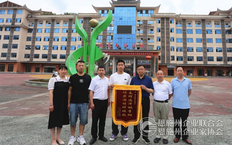 2024年恩施州南四县物理方向高考状元黄国辉(左四)向咸丰春晖高级中学赠送锦旗。