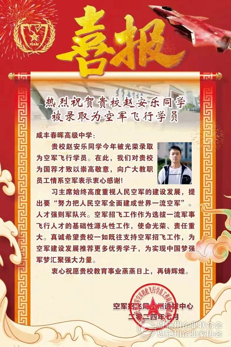 6月高考季,春晖传捷报。2024年6月,咸丰春晖高级中学高考再创佳绩,各项指标再攀历史新高:黄国辉同学以667分斩获南四县(咸丰、来凤、宣恩、鹤峰)物理方向第一名,该校连续两年获此佳绩。过特殊控制线103人(其中中考成绩全县前300名仅有17人),突破百人大关,增长率为506%;过本科线605人(中考成绩全县前1400名仅有166人),突破六百人大关,增长率为264%。高复中心194人参考,人均提分72.3分,其中提分100分以上有26人,提高80分以上有74人,提高60分以上有114人,尤其是唐广李同学从197分提高至514分,净增317分,创新该校提分纪录。赵安乐同学被空军招飞局广州选拔中心录取为空军飞行学员,实现学校空军招飞零的突破。