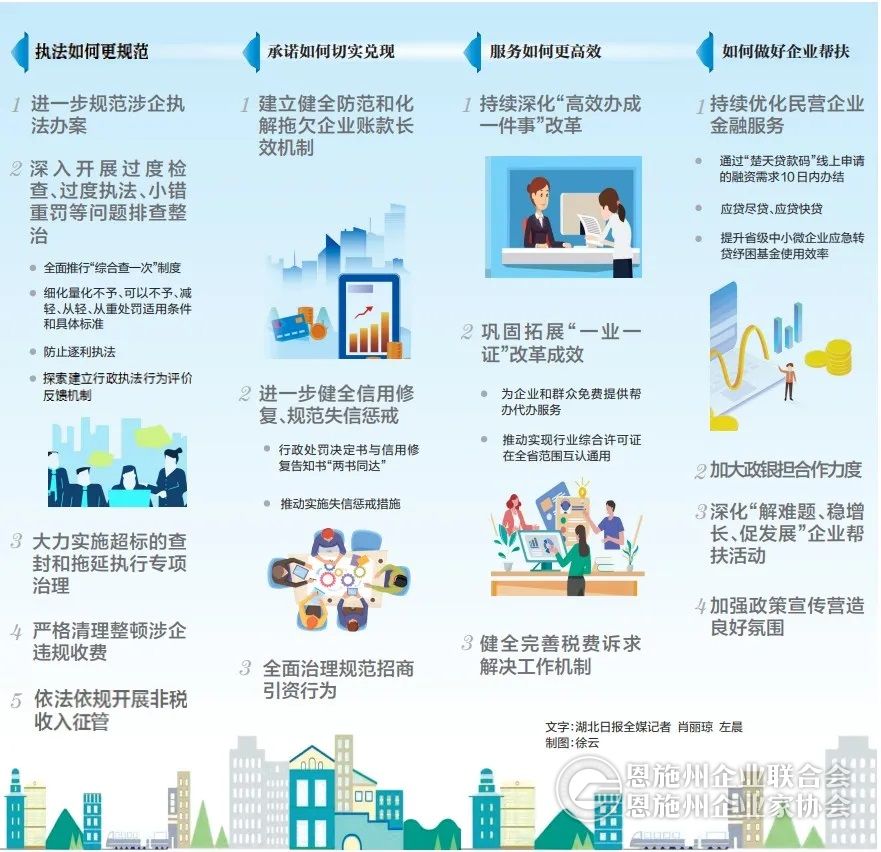 十五、加强政策宣传营造良好氛围。全面梳理公开惠企政策事项清单,鼓励从经营主体视角开展政策解读,会同协会商会面向经营主体开展热点政策专题宣传解读系列活动,不断提高政策知晓率和覆盖面。充分利用报、刊、网、电、端等载体,讲好湖北营商环境故事,大力营造宜商兴业良好氛围。《措施》要求,各级各部门要强化责任担当,加强协同联动,扎实推进各项政策落地见效;注重举一反三,建立长效常态机制,形成制度性成果;持续整治形式主义为基层减负,规范涉企会议、调研活动,着力减轻经营主体负担。省发改委(省营商办)要加强统筹协调,协调解决工作推进中遇到的问题,对涉嫌违纪违法问题按程序移交纪检监察机关处理。