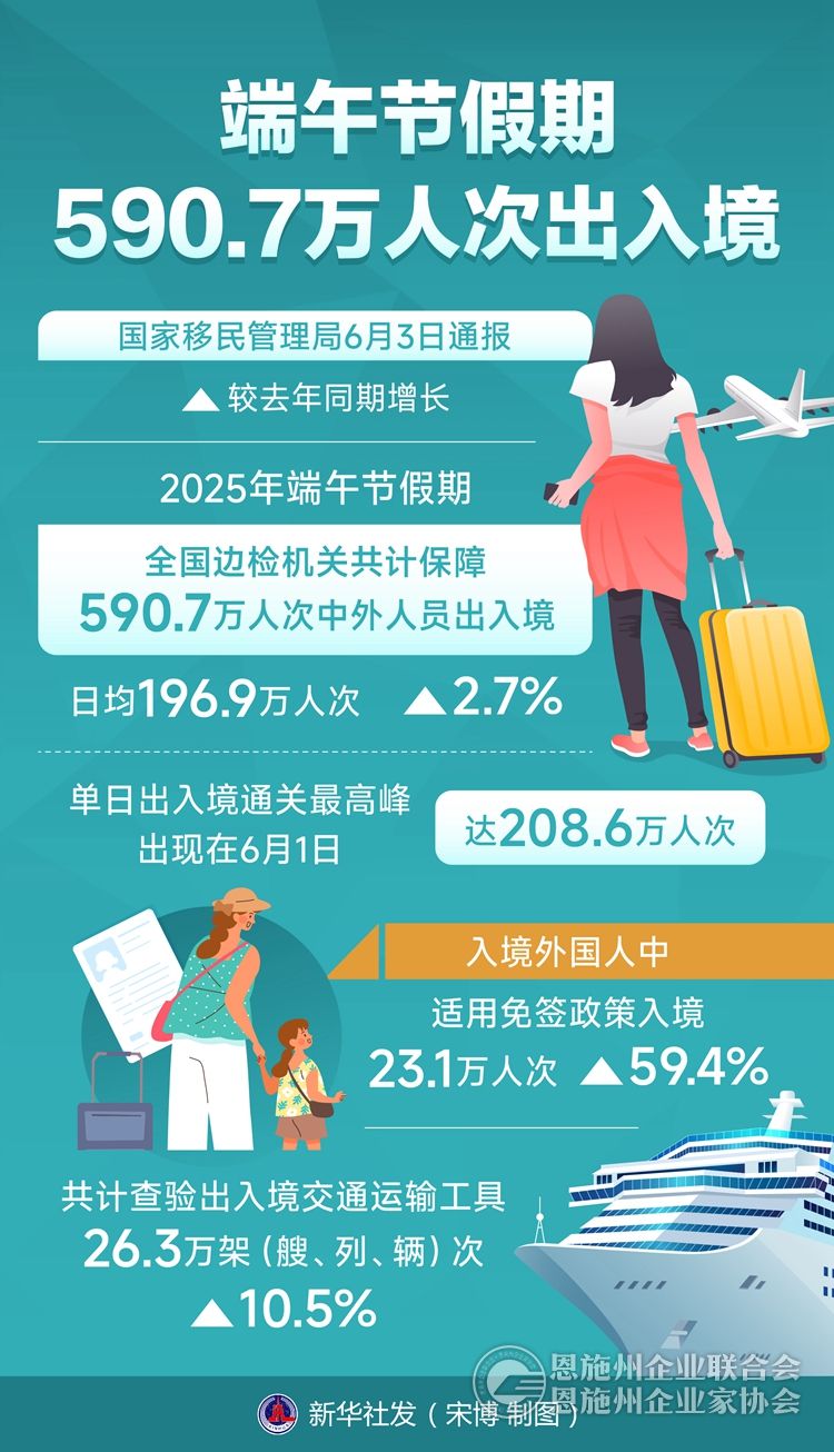 国家移民管理局3日通报,今年端午节假期全国边检机关共计保障590.7万人次中外人员出入境,日均196.9万人次,较去年端午节同期增长2.7%;单日出入境通关最高峰出现在6月1日,达208.6万人次。入境外国人中,适用免签政策入境23.1万人次,较去年同期增长59.4%。共计查验出入境交通运输工具26.3万架(艘、列、辆)次,较去年同期增长10.5%。