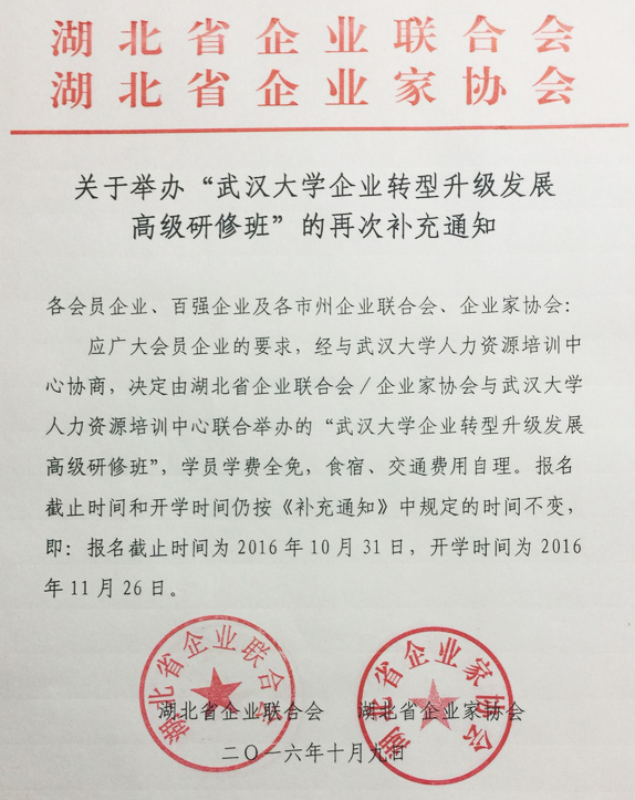 关于举办“武汉大学企业转型升级发展高级研修班”的再次补充通知